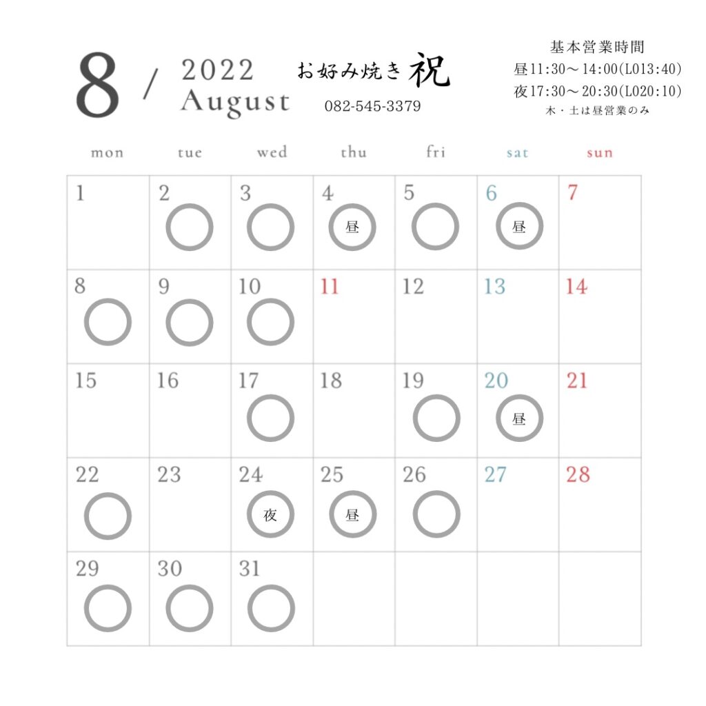 8月の営業日は、写真の通りとなります。