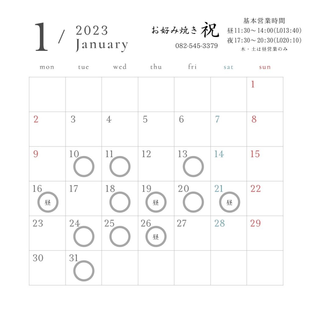 「昼」と明記のある日は昼(11:30〜14:00)のみの営業となります。