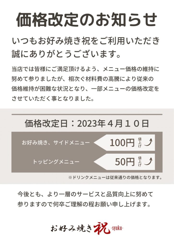 いつもお好み焼き祝をご愛顧いただき誠にありがとうございます。