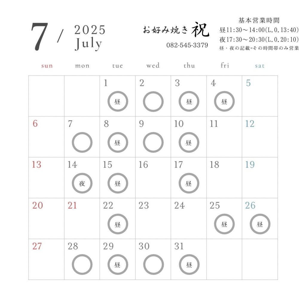 「昼」と明記のある日は昼(11:30〜14:00)のみの営業となります。