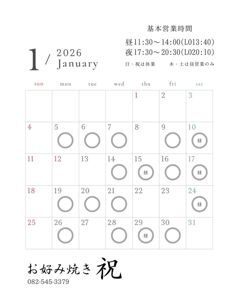 遅くなりましたが、1月の営業日は、写真の通りとなります。